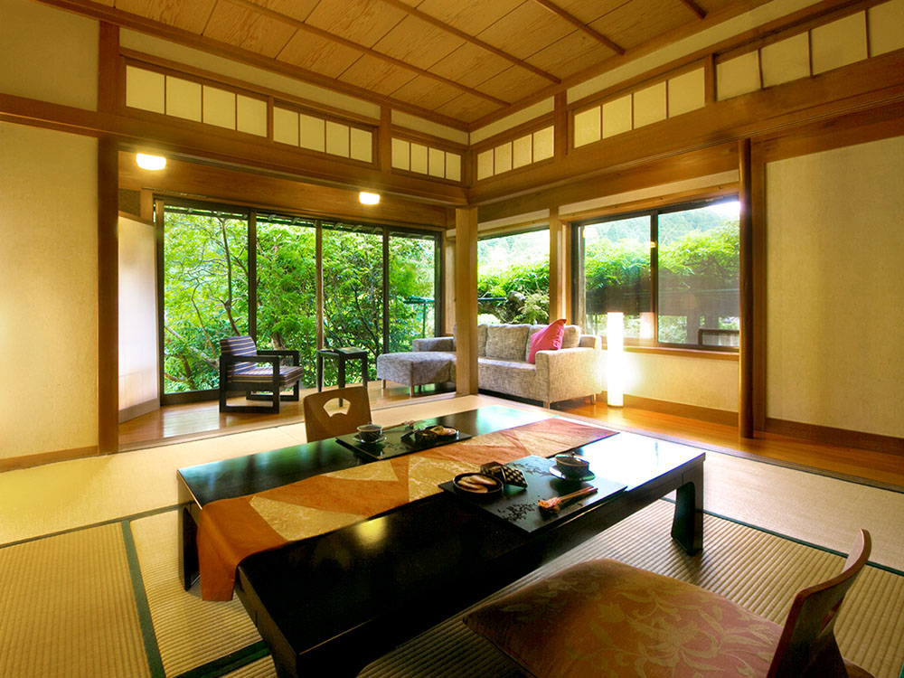 碧莊共有八間客房,全數以獨棟和風建築構成。在這裡可以享受不被任何人打擾、輕鬆愜意的獨立空間。所有客房在林綠蔭深包圍下,優雅簡樸。不同暖色系基調的房型,在燈光與裝飾下,呈現不同的「和」的氛圍,宛若置身世外桃源。其中「紅葉之間」是昭和初期文豪詩人們鍾愛的客房,在這個蔥鬱文風的客房中,文豪們創作出一篇又一篇、一首又一首流傳後代的優美作品與詩句。