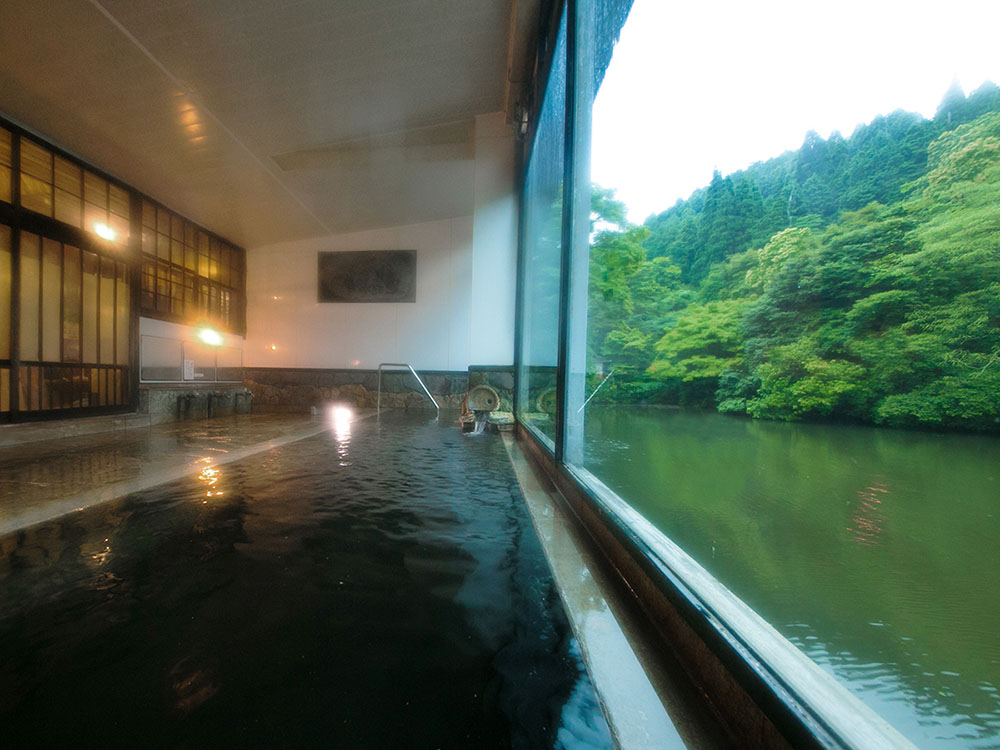 大浴場長長的大玻璃窗外就是蔥鬱茂密的碧塘,寬廣的視野讓整體空間更顯開放通透,舒服閒適。