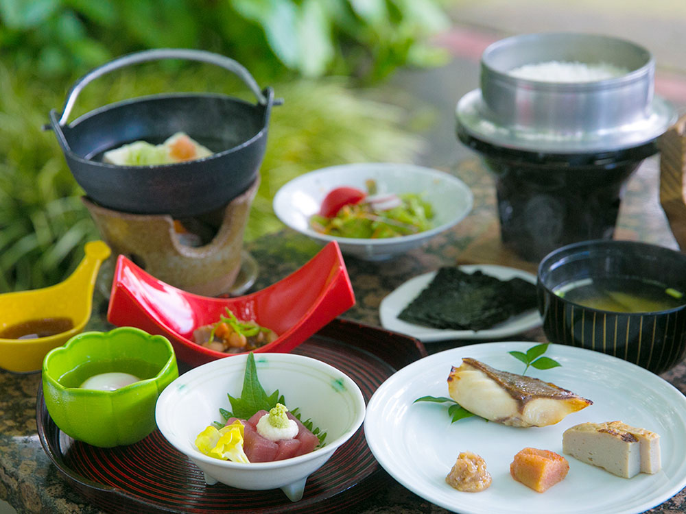早餐是日式餐點,春季到秋季的晴天,可以坐在滿覆紫藤花的湖畔露臺邊,品嚐美味的早餐,欣賞碧塘與庭院景觀。