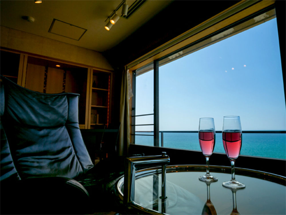 高級套房內裝精緻奢華,附起居室與檜木浴池。從客廳的落地窗或浴室都能一覽無邊海景。