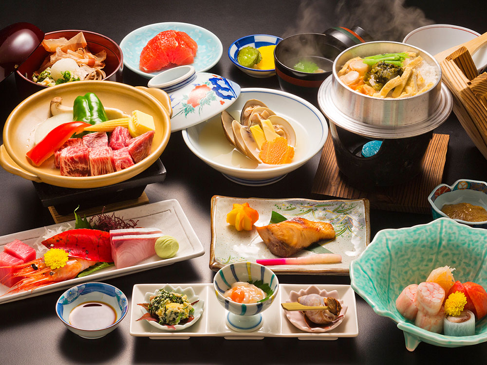 福井県產的「若狭牛」,搭配特製味噌的「朴葉焼き」(hoobayaki),是饕客必點的鄉土料理。匯集各式山珍海味的「基本會席」,是高CP值的選擇。奢豪的鮑魚與螃蟹等佳餚也提供單點服務。